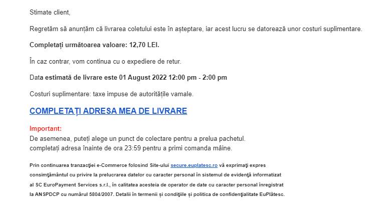Posta Romana ne-a atentionat in diverse randuri in legatura cu aceste tipuri de fraude online, iar daca primiti de la cineva mesajul de mai jos, trebuie sa il ignorati pentru a nu deveni o victima.