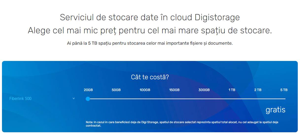 DIGI Romania le ofera clientilor cu abonamente Fiberlink 500 cate 20 GB de spatiu gratuit in DIGI Storage, iar clientilor Fiberlink 1000 cate 50 GB de spatiu gratuit in cadrul DIGI Storage, deci suficient de mult pentru a stoca o varietate de date, astfel ca merita sa aveti in vedere ceea ce a fost gandit de catre companie.