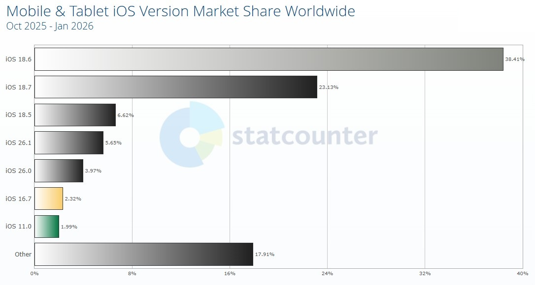 iOS 26, potrivit datelor publice StatCounter pentru luna ianuarie 2026, este prezent pe doar aproximativ 15 pana la 16% dintre iPhone-urile active la nivel global. Proportiile sunt impartite intre versiuni: iOS 26.1 ar reprezenta circa 10,6% dintre dispozitive, iOS 26.2 aproximativ 4,6%, iar iOS 26.0 in jur de 1,1%. In paralel, majoritatea ramane pe generatia anterioara: peste 60% dintre iPhone-urile urmarite raman pe iOS 18, cu iOS 18.7 si iOS 18.6 avand, impreuna, ponderea dominanta.