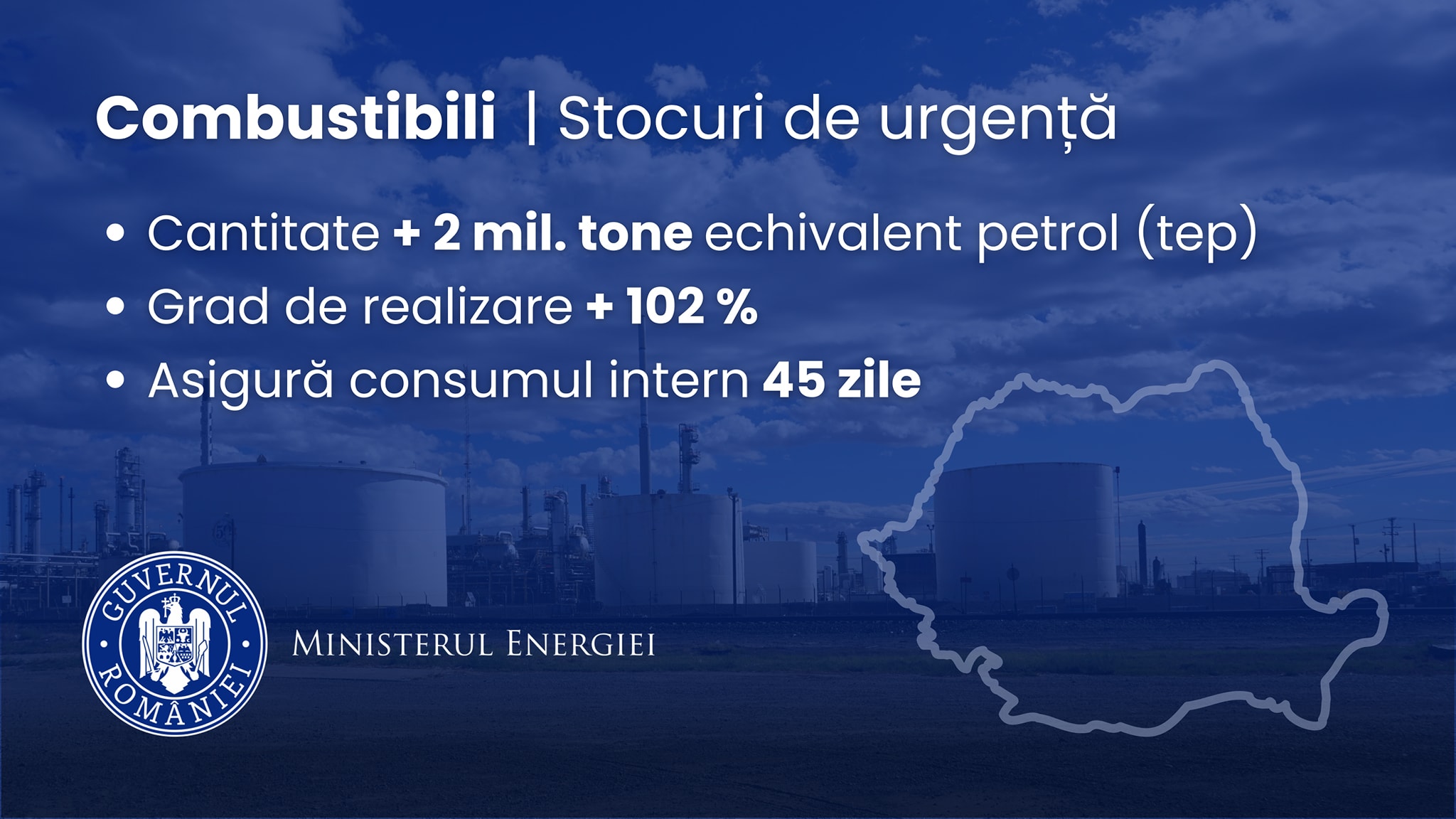 Potrivit informatiilor comunicate, Ministerul Energiei gestioneaza stocuri de urgenta de peste 2 milioane tone echivalent petrol, in calitate de autoritate competenta pentru constituirea si mentinerea acestor rezerve strategice. Mai mult decat atat, gradul actualizat de realizare al stocurilor a depasit 102%, ceea ce indica faptul ca nivelul necesar nu doar ca este atins, ci chiar depasit.