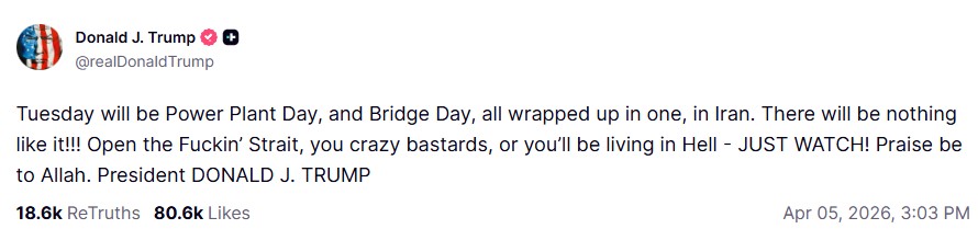 “Marți va fi Ziua Centralei Electrice și Ziua Podului, toate la un loc, în Iran. Nu va fi nimic asemănător!!! Deschideți Strâmtoarea afurisită, nebuni ticăloșilor, sau veți trăi în Iad – DOAR UITAȚI-VĂ! Slavă lui Allah.” a declarat Donald Trump.